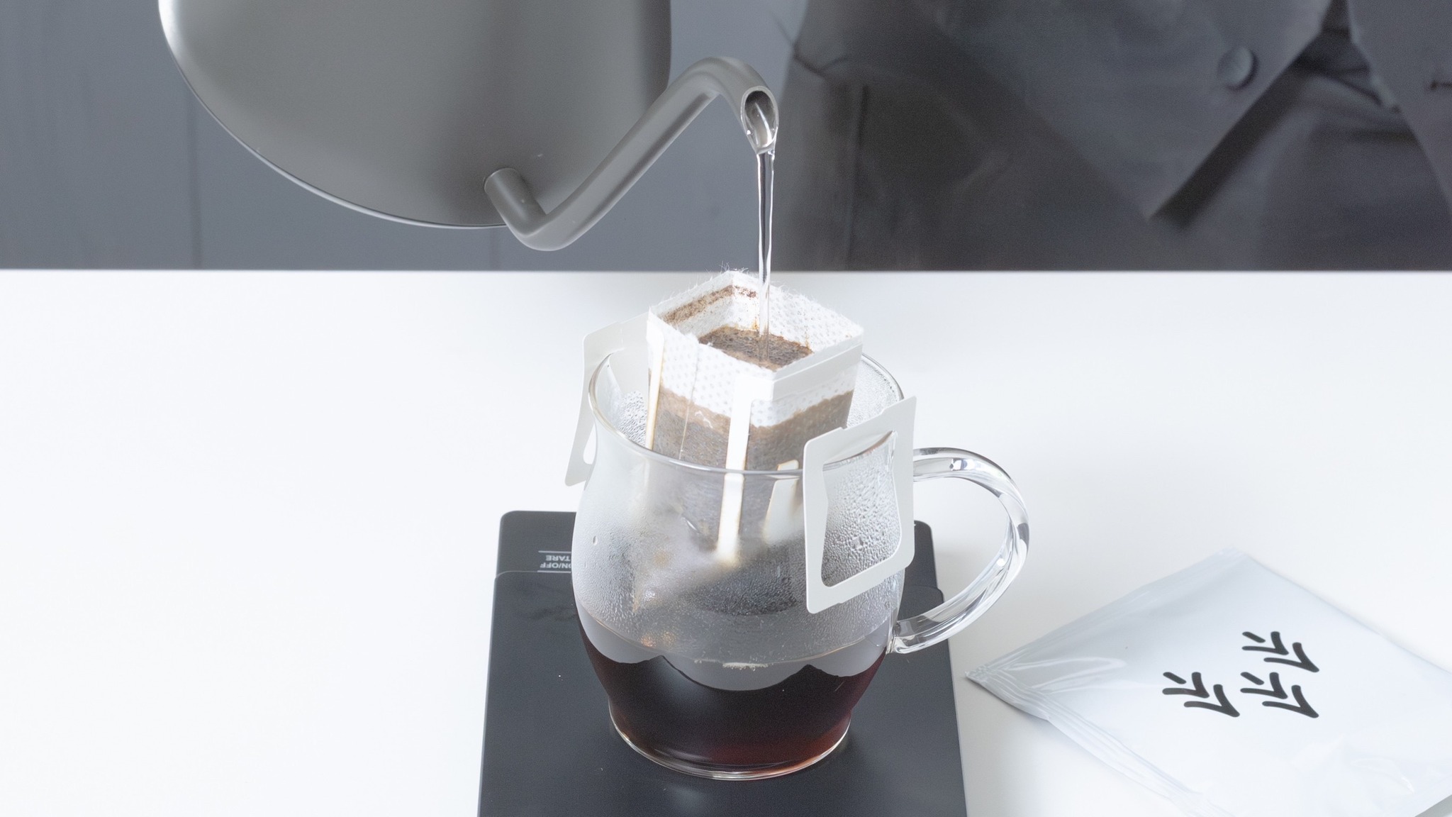 ②お湯をドリップバッグの半分くらいまで注ぎ20秒待つ