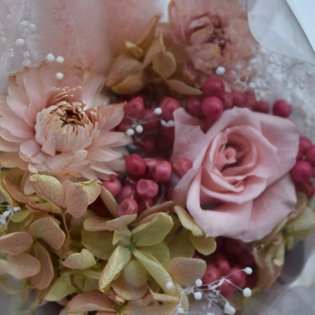 綺麗にドライフラワーにしたお花や、プリザーブドフラワーを使用し一つ一つ丁寧に作り上げました。